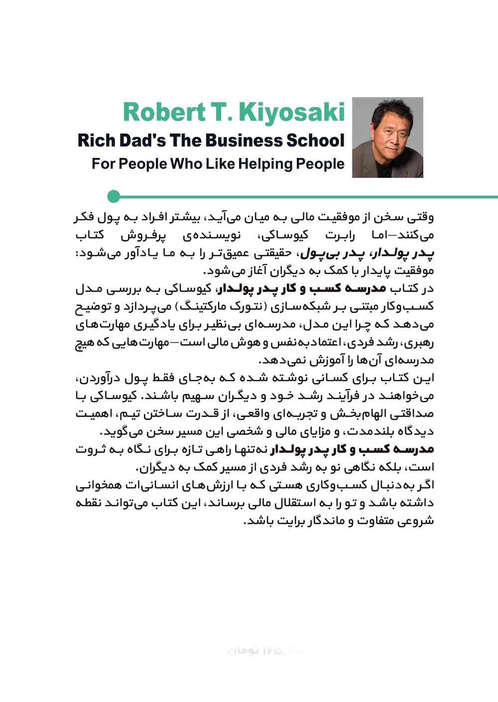 رابرت کیوساکی (متولد1947)است .رابرت تورو کیوساکی تاجر و نویسنده آمریکایی است. کیوساکی بنیانگذار Rich Global LLC و Rich Dad Company است، یک شرکت خصوصی آموزش مالی که آموزش امور مالی شخصی و کسب و کار را از طریق کتاب و فیلم به مردم ارائه می کند.بیشتر به خاطر کتاب پدر پولدار، پدر فقیر، پرفروشترین شماره یک نیویورک تایمز شناخته میشود. کیوساکی با ربع جریان نقدینگی پدر ثروتمند و راهنمای سرمایه گذاری پدر ثروتمند همراه شد.