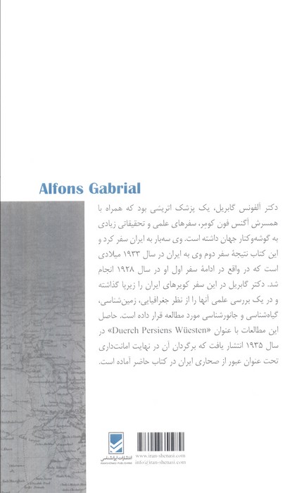 دکتر گابریل، پزشک و پژوهشگر اتریشی است که به همراه همسر خود سه بار به ایران سفر کرد؛ نتیجه ی سفرهای آنها دو کتاب پربار به نام تحقیقات جغرافیایی راجع به ایران و عبور از صحاری ایران، می باشد. در کتاب پیش رو، او از نظر جغرافیایی، زمین شناسی، گیاه شناسی و جانورشناسی و … کویر های ایران را مورد مطالعه قرار داده است و حاصل آن سفرنامه ی دلکش و علمی پیش رو می باشد.