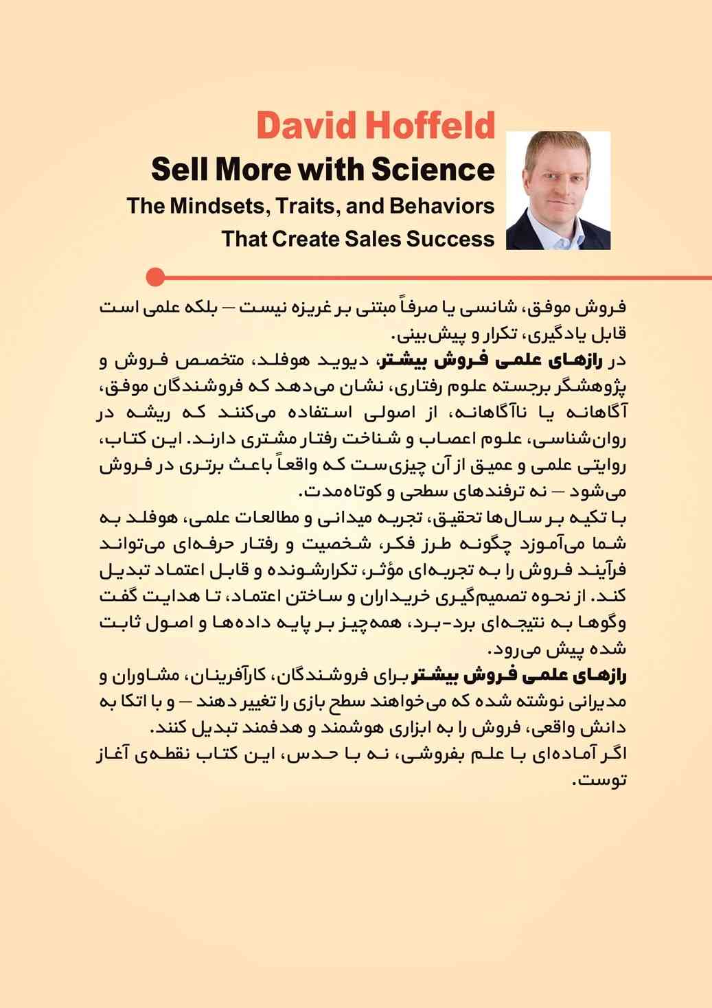این کتاب شهرت دیوید هافلد را به عنوان مدافع اصلی فروش مبتنی بر علم تقویت می کند. او کلیدهای بهبود فروش شما را با ارائه بینش های خاص و عملی، بر اساس داده های محکم و بازبینی شده، رمزگشایی می کند.