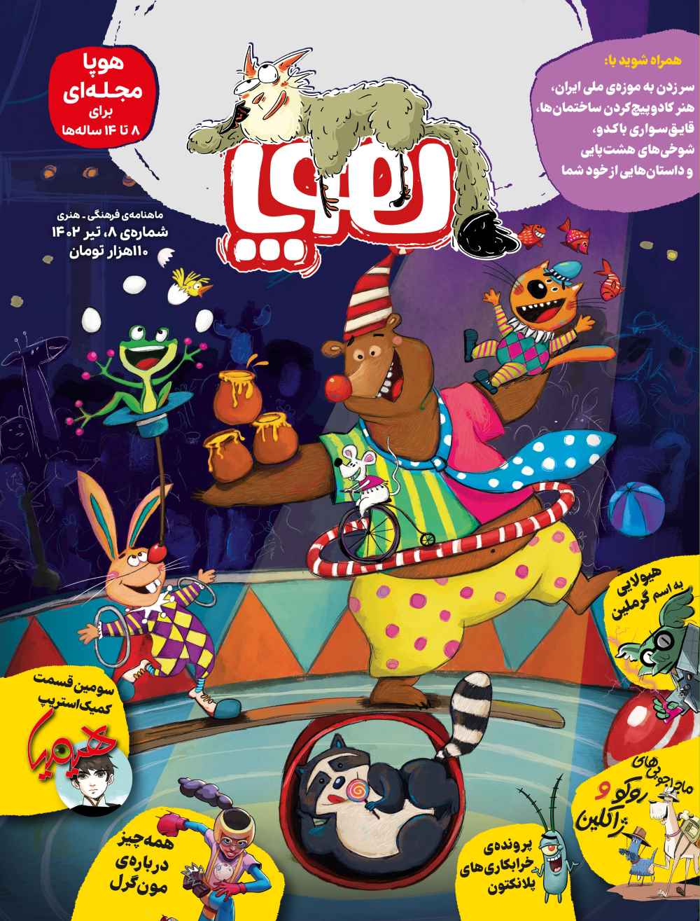 در شمارهی هشتم مجلهی هوپا، پروندهی خرابکاریهای «آقای پلانکتون» در کارتون باباسفنجی را بررسی میکنیم. دربارهی «گابلینها» که خودشان را در بازیهای موبایل و فیلمها جا کردهاند، میخوانیم. چند صفحه از کتاب «آلیس در سرزمین عجایب» را ورق میزنیم. قسمت سوم کمیکاستریپ جذاب «هیمیا» را میخوانیم تا بفهمیم پسر خوشتیپ عجیبی که وارد داستان شده چه قصدی دارد. در آشپزخانهی هودی، یکچیزی شبیه «بستنی» درست میکنیم که بستنی نیست! با تصویرگر خلاق «ماهی سیاه کوچولو» آقای فرشید مثقالی آشنا میشویم. هنر عجیب «کادوپیچکردن همهچیز حتی ساختمانها» را میشناسیم. به هیولاگرام سر میزنیم و کپشن یک هیولای کنجکاو به اسم «گرملین» را میخوانیم. یک «میزگرد» پر از جک و شوخی داریم. با ورزش باحال «قایقرانی با کدو» آشنا میشویم و یک عالم مطلب جذاب و خواندنی دیگر...