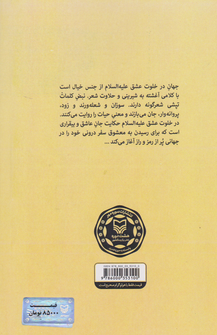 جهان در خلوت عشق علیه السلام از جنس خیال است به شیرینی و حلاوت شعر. نبض کلمات تپشی شعرگونه دارند. سوزان و شعله ورند و زود پروانه وار جان میبازند و معنی حیات را روایت میکنند. در خلوت عشق علیه السلام حکایت جان عاشق و بیقراری است که برای رسیدن به معشوق سفر درونی خود را در جهانی پر از رمز و راز آغاز میکند.