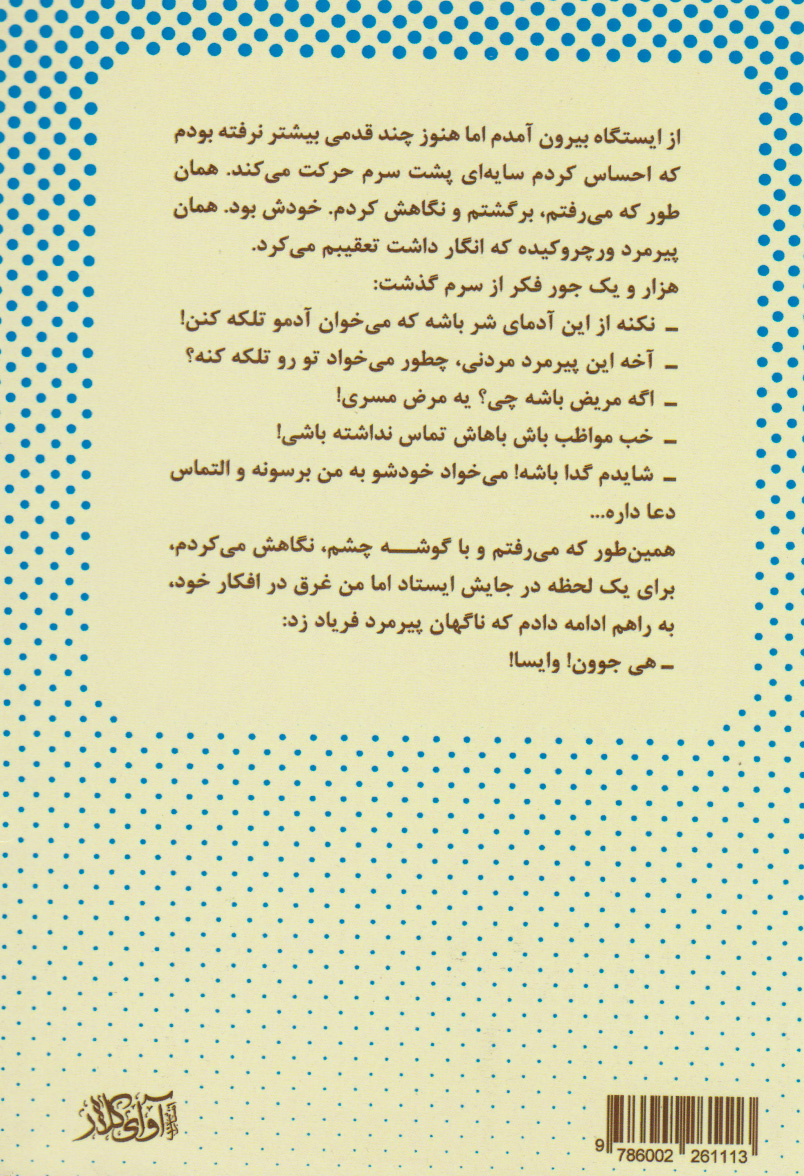 از ایستگاه بیرون آمدم اما هنوز چند قدمی بیشتر نرفته بودم که احساس کردم سایهای پشت سرم حرکت میکند. همان طور که میرفتم برگشتم و نگاهش کردم. خودش بود. همان پیرمرد ورچروکیده که انگار داشت تعقیبم میکرد. هزار و یک جور فکر از سرم گذشت: نکنه از این آدمای شر باشه که میخوان آدمو تلکه کنن! آخه این پیرمرد مردنی چطور میخواد تو رو تلکه کنه؟ اگه مریض باشه چی؟ یه مرض مسری! خب مواظب باش باهاش تماس نداشته باشی! شایدم گدا باشه! میخواد خودشو به من برسونه و التماس دعا داره... همین طور که میرفتم و با گوشه چشم، نگاهش میکردم، برای یک لحظه در جایش ایستاد اما من غرق در افکار خود، به راهم ادامه دادم که ناگهان پیرمرد فریاد زد: هی جوون! وایسا!
