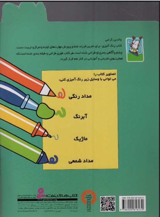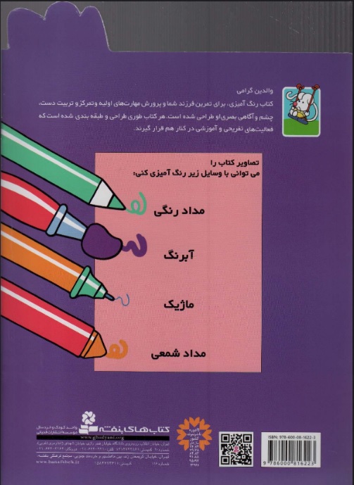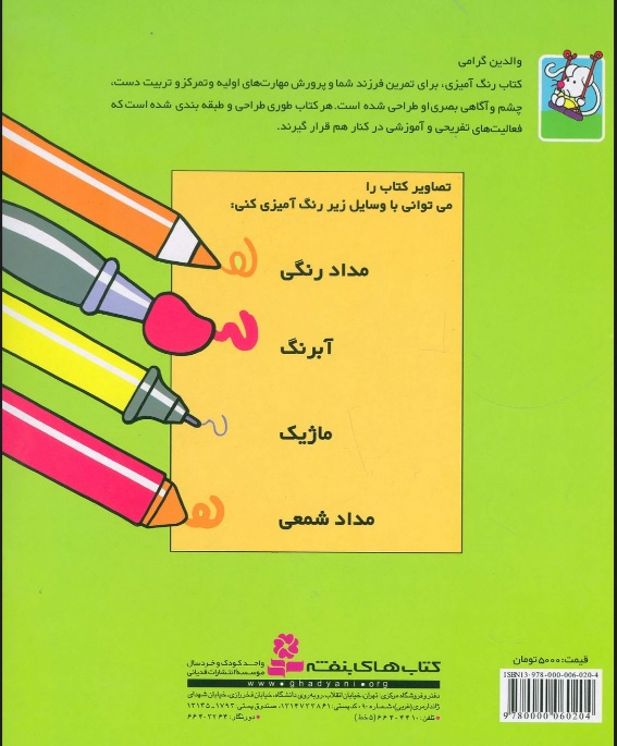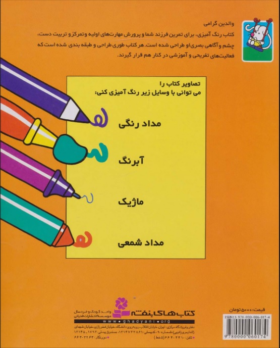 کتاب رنگ آمیزی، برای تمرین فرزند شما و پرورش مهارت های اولیه و تمرکز و تربیت دست، چشم و آگاهی بصری او طراحی شده است. هر کتاب طوری طراحی و طبقه بندی شده است که فعالیت های تفریحی و آموزشی در کنار هم قرار گیرند. تصاویر کتاب را می توانی با وسایلی همچون مداد رنگی، آبرنگ، ماژیک و مداد شمعی رنگ آمیزی کنید.