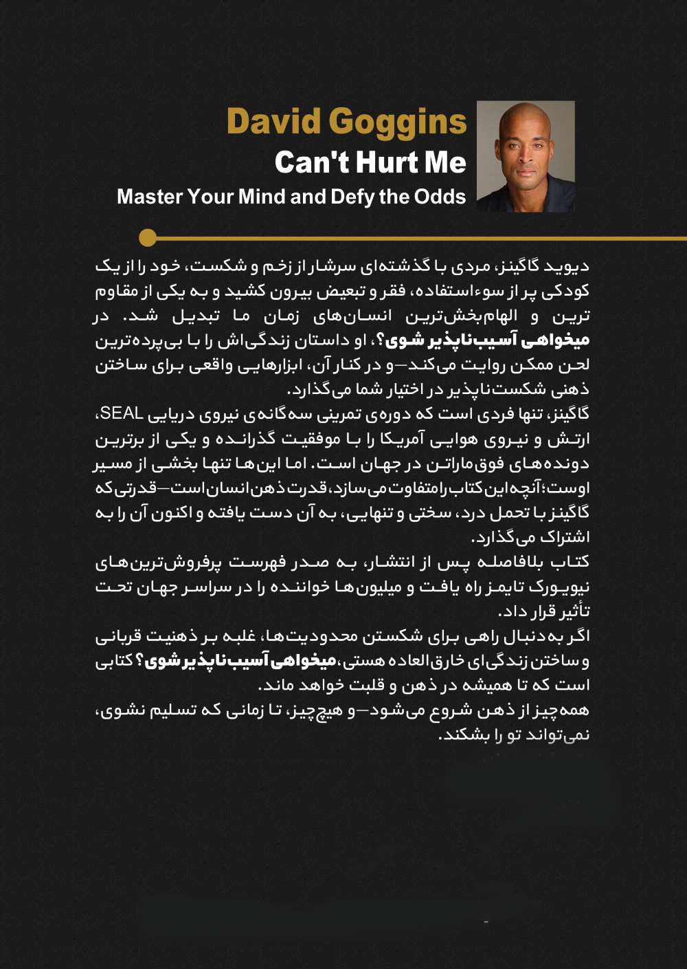 با تمام شدن کتاب دیوید گاگینز ، شما ذهنیت قربانی خود را کنار خواهید گذاشت. جایی که پس از خواندن کتاب به آنجا می روید کاملا مربوط به شماست. او به عنوان مردی که خلاء بزرگی در قلب خود داشت، به شما می گوید هیچ عذر و بهانه ای در زندگی وجود ندارد، بلکه تنها دلایلی برای تلاش بیشتر وجود دارد.