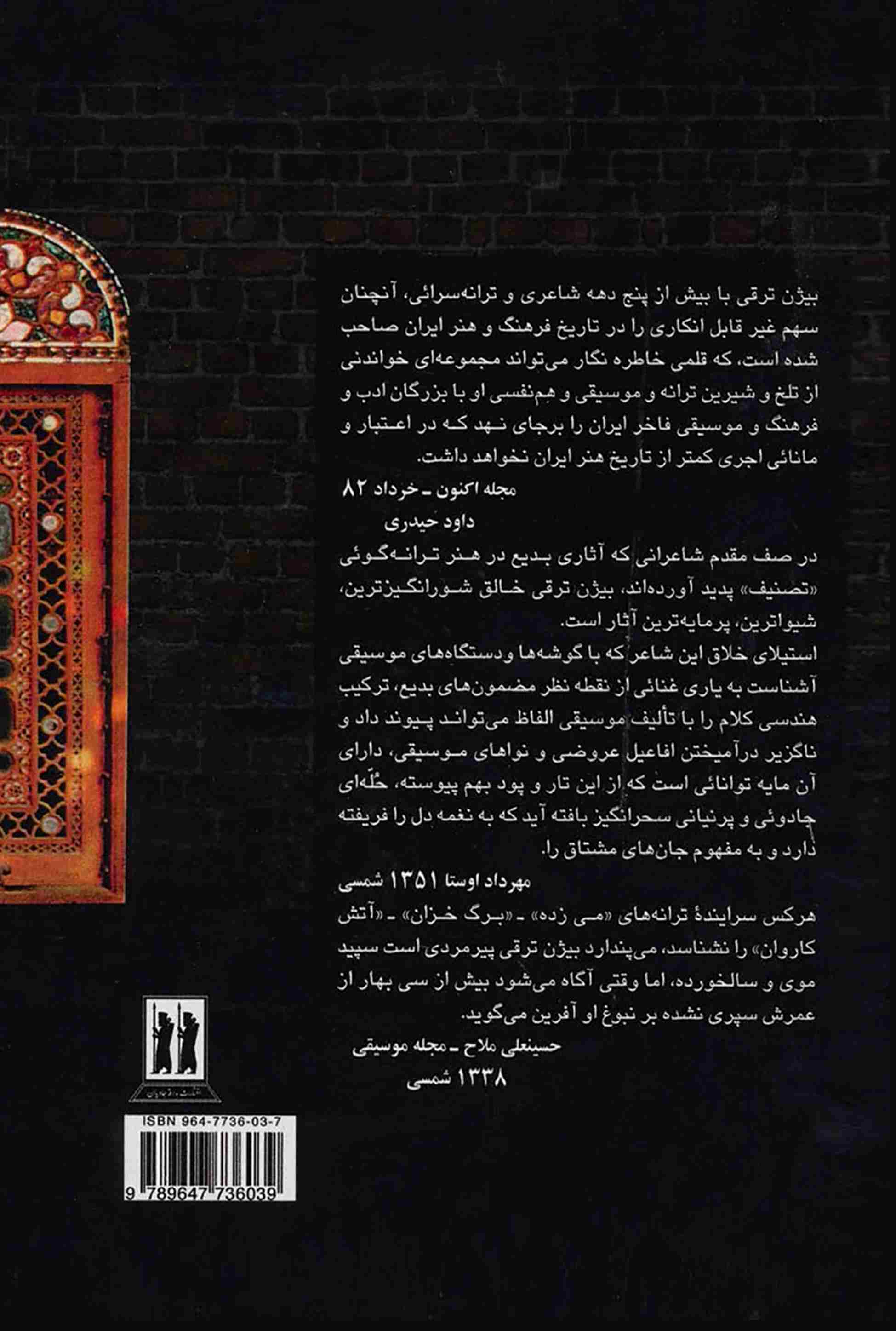 آتش کاروان با صدای دلکش یکی از پرآوازهترین ترانههای اوست. بیژن ترقی ترانههای به یاد ماندنی بهار دلنشین، آتش کاروان و برگ خزان و نیز سرود وطنم (ایران جوان با صدای سالار عقیلی) را سرودهاست. بیژن ترقی در ۱۲ اسفند ۱۳۰۸ در شهر تهران به دنیا آمد.