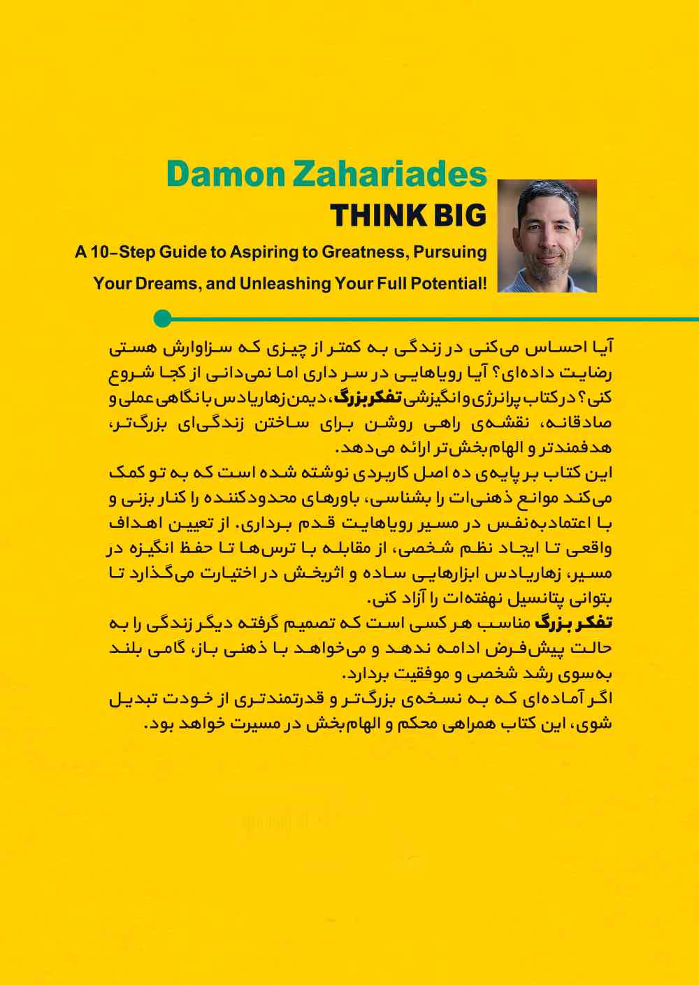 این کتاب دو هدف دارد. اولین هدف این است که این کتاب یک راهنمای گامبهگام است که یادتان میدهد چگونه امروز و نیز در دوران باقیماندهی زندگیتان بزرگتر بیندیشید. به شما کمک میکند تا دیدگاهی کاملا متفاوت را برای دیدن دنیای اطرافتان در خود توسعه دهید. راهبندهای مسیر را ندیده، در عوض فرصتها را خواهید دید. بهجای آنکه احساس کنید در دام محدودیتهای خود گیر افتادهاید، با ظرفیتهای جدید احساس آزادی میکنید. دیگر دنیا را از دریچهی لنزی که با بدبینی و منفینگری رنگ شده است نمیبینید و در عوض هرچیزی که اطرافتان است را با خوشبینی و اشتیاق نظارهگر خواهید شد. این تغییرات در یک بشکنزدن اتفاق نمیافتند. بهسادگی بالاوپایین کردن کلید برق هنگام روشنکردن لامپ اتاق نشیمنتان نیست. یک فرایند است و این کتابی که در دست شماست، کتابچهی راهنمایتان در این فرایند است. قرار است بهواسطهی کل فرایند، گامبهگام هدایتتان کند. دومین هدف کتاب بزرگ فکر کنید این است که به شما انگیزه دهد. هنگامی که دارید بزرگتر فکرکردن را میآموزید، با مقاومت درونی مواجه میشوید. این طبیعی است. احتمالا بخش زیادی از زندگیتان را صرف تمرکز بر آنچه شدنی، معقول و عملی است کردهاید. ذهنتان با این الگوی فکری راحت است و با تلاشهای شما برای توسعهی دیدگاهی بلندپروازانهتر مقاومت میکند. ذهنتان برای ترک حاشیهی امن هیچ تمایلی از خود نشان نمیدهد.