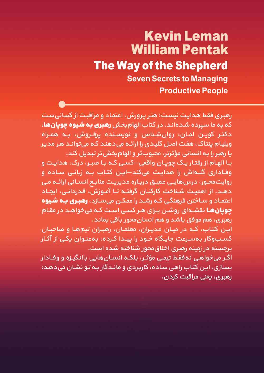 اگر به دنبال راهبردها و روشی کارآمد برای مدیریت و رهبری افرادتان هستید، این کتاب دقیقا همان چیزی است که به دنبالش میگردید. شیوۀ چوپان، روشی باستانی است که از گذشتههای دور تا آیندۀ پیش رو کارآمد است و هرگز قدیمی نمیشود. در این روش، هفت اصل حیاتی و ضروری آموزش داده میشود که با انجام همۀ، تبدیل به مدیری معتمد خواهید شد که افراد زیردستتان با وفاداری کامل برایتان کار میکنند و با اعتماد از شما پیروی میکنند.