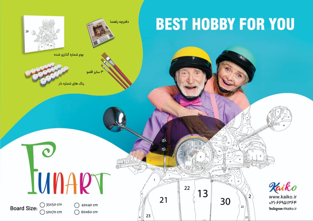 محتوی: بوم شمارهگذاری شده، رنگهای شمارهدار، 3 سایز قلمو، دفترچه راهنما