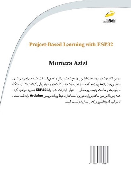 آموزش پروژه محور ESP32 اجرای بیش از 15 پروژه جذاب و کاربردی کنترل اشیا با بلوتوث و اینترنت، ساخت کارت خوان بازی مونوپولی و ...: در این کتاب، شما را در ساخت اولین پروژه چشمکزن تا پروژههای اینترنت اشیاء همراهی میکنیم. با اجرای بیش از ۱۵ پروژه جذاب از قفل هوشمند و کارتخوان مونوپولی گرفته تا کنترل دستگاه با بلوتوث و ساخت وبسرور محلی دنیای اینترنت اشیاء را با ESP32 تجربه خواهید کرد. همهچیز با آموزشی ساده، پروژهمحور و با استفاده از محیط برنامهنویسی Arduino ارائه شده است، تا بتوانید قدمبهقدم پروژهها را بسازید و تست کنید.