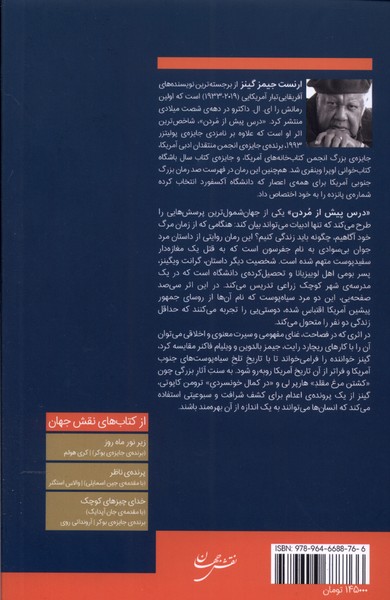 ارنست جیمز گینز از برجسته ترین نویسنده های آفریقایی تبار آمریکایی( 2019-1933) است که اولین رمانش را ای. ال. داکترو در دهه ی شصت میلادی منتشر کرد. «درس پیش از مردن»، شاخص ترین اثر او است که علاوه بر نامزدی جایزه ی پولیتزر 1993، برنده ی جایزه ی انجمن منتقدان ادبی آمریکا، جایزه ی بزرگ انجمن کتابخانه های آمریکا، و جایزه ی کتاب سال باشگاه کتاب خوانی اوپرا وینفری شد. همچنین این رمان در فهرست صد رمان بزرگ جنوبی آمریکا برای همه ی اعصار که دانشگاه آکسفورد انتخاب کرده شماره ی پانزده را به خود اختصاص داد.