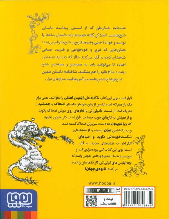 شاخنامه همانطور که از اسمش پیداست داستان شاخهاست. اصلا کی گفته همیشه باید داستان شاهها را نوشت و خواند؟ خیلی وقتها تاریخ را شاخها رقم میزنند؛ همانهایی که غرور و خودخواهی و قدرت، حسابی شاخشان کرده و فکر میکنند حالا که دنیا به دستشان افتاده تا میتوانند باید به همهچیز و همهکس شاخ بزنند و شاخ بقیه را هم بشکنند. شاخنامه داستان همین شاختوشاخ شدنهاست و آخروعاقبت شاخهای دراز. قرار است توی این کتاب ناگفتههای ابلیس لعنتی را بشنوید. یعنی برای یک بار هم که شده ابلیس از زبان خودش داستان ضحاک و جمشید را تعریف کند، از نسبت فامیلیاش با مارهای روی دوش ضحاک بگوید و از نفرتش به کارهای خوب جمشید. قرار است کلی حرص بخورد که چرا فریدون به دست سربازان ضحاک کشته نشد و به پادشاهی ایران رسید، و از نقشههای شکستخوردهاش بگوید و امیدهای الکیاش به نقشههای جدید.