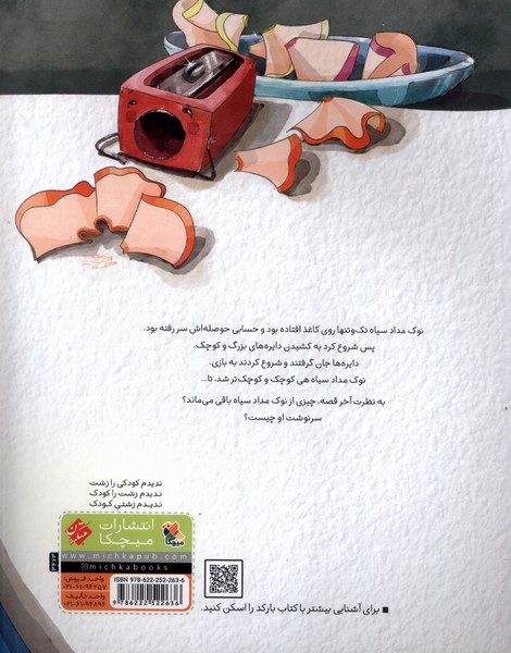 اما دایره از ماهیهای برکه پرسید و نوک، که بلد نبود ماهی بکشد، دوباره چرخید و دایرههای کوچکتری کشید. دایرههای جدید با هم گفتگو کردند و نوک از آنها خواست تا چرخهای دوچرخه یا چرخفلک باشند. آنها با هم بازی کردند و خندیدند آنقدر بلند که صدایشان مدادرنگیهای دیگر را بیدار کرد. مدادرنگیها اعتراض کردند. ولی بعد که متوجه شدند روی کاغذ سفید چه اتفاقی افتاده است به حرکت در آمدند تا جهانی را که نوک شروع کرده کامل کنند.