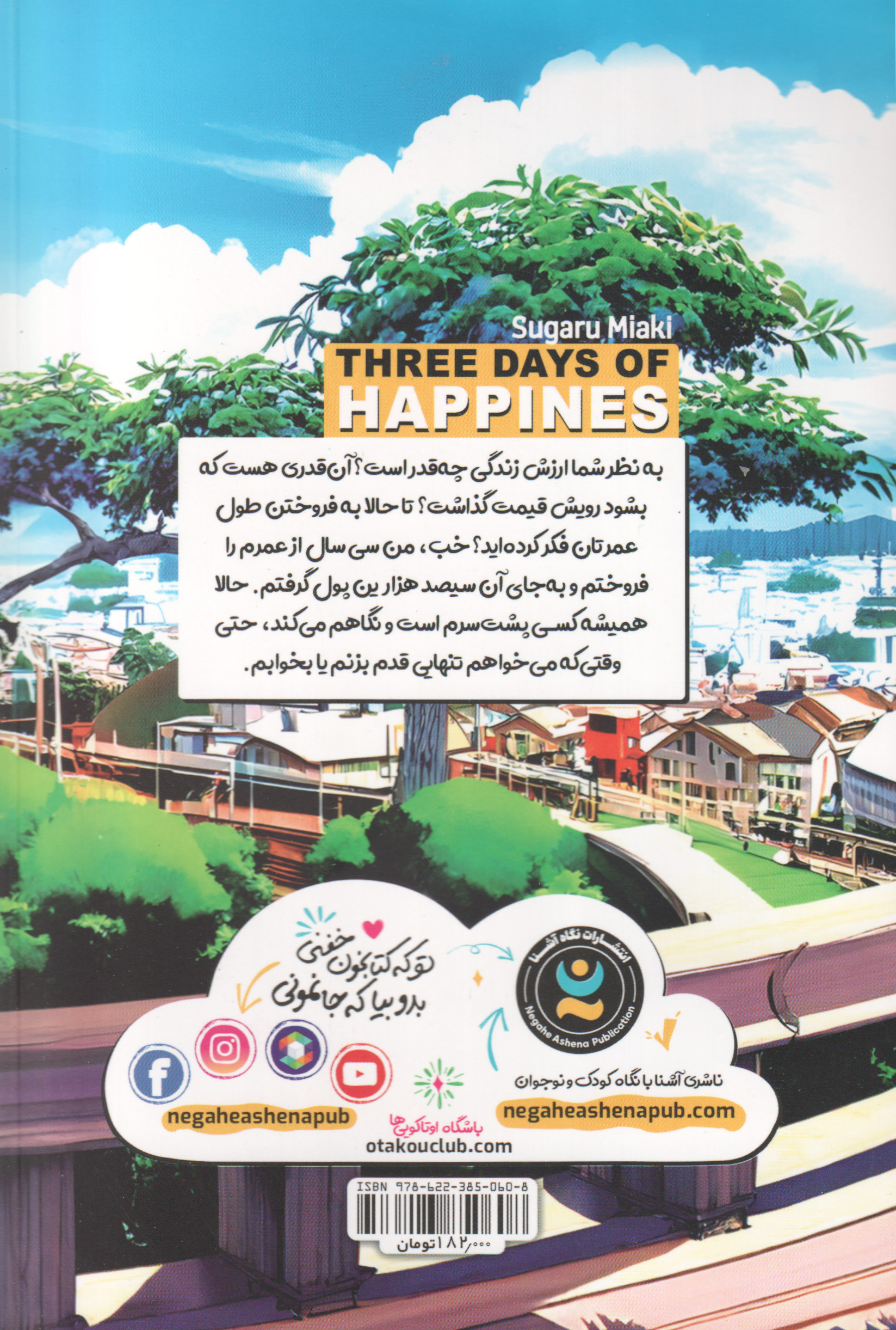 کتاب "سه روز شادی" (Three Days of Happiness) اثر سوگارو میاکی (Sugaru Miaki) یک رمان ژاپنی کوتاه و تأثیرگذار است که در سال ۲۰۱۳ منتشر شد. این کتاب به دلیل داستان عمیق و احساسیاش، توجه بسیاری از خوانندگان را به خود جلب کرده و به چندین زبان ترجمه شده است.
