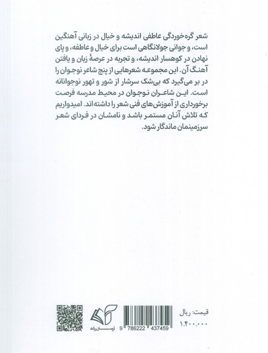 شعر گره خوردگی عاطفی اندیشه و خیال در زبانی آهنگین است و جوانی جولانگاهی است برای خیال و عاطفه و پای نهادن در کوهسار اندیشه و تجربه در عرصه زبان و یافتن آهنگ آن. این مجموعه شعرهایی از پنج شاعر نوجوان را در برمیگیرد که بیشک سرشار از شور و تهور نوجوانانه است. این شاعران نوجوان در محیط مدرسه فرصت برخورداری از آموزشهای فنی شعر را داشته اند. امیدواریم که تلاش آنان مستمر باشد و نامشان در فردای شعر سرزمینمان ماندگار شود .