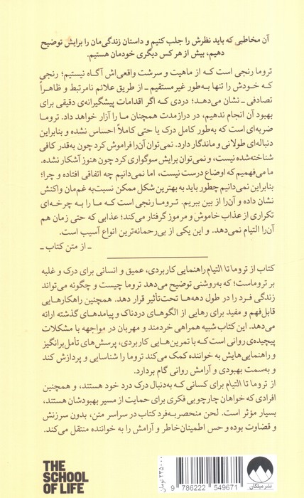 کتاب از تروما تا التیام راهنمایی کاربردی، عمیق و انسانی برای درک و غلبه بر تروماست؛ که به روشنی توضیح میدهد ترومـا چیست و چگونه میتواند زندگی فرد را در طول دهها تحتتأثیر قرار دهد. همچنین راهکارهایی قابل فهم و مفید برای رهایی بر الگوهای دردناک و پیامدهای گذشته ارائه میدهد. این کتاب شبیه همراهی خردمند و مهربان در مواجهه با مشکلات پیچیدهی روانی است که با تمرینهای کاربردی، پرسشهای تأملانگیز و راهنماهایش به خواننده کمک میکند تروما را شناسایی و پردازش کند و به سمت بهبودی و آرامش روانی گام بردارد.