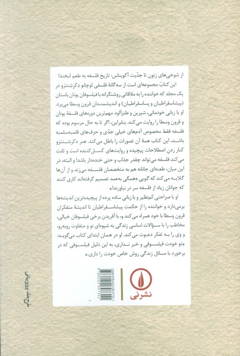 از شوخی های زنون تا جدیت آکوپناس: تاریخ فلسفه به طعم لبخند! این کتاب مجموعهای است از سه گانه فلسفی لوچانو دکرشنتزو در یک مجلد که خواننده را به ملاقاتی روشنگرانه با فیلسوفان یونان باستان (پیشاسقراطیان و پساسقراطیان) و اندیشمندان قرون وسطا می برد. او با زبانی خودمانی، شیرین و طنزآلود مهمترین دورههای فلسفه یونان و قرون وسطا را روایت میکند. بنابراین اگر تا به حال مرسوم بوده که فلسفه فقط مخصوص آدمهای خیلی جدی و حرفهای قلمبه سلمبه باشد، این کتاب همه آن تصورات را باطل می کند. هنر دکرشتتزو کنار زدن اصطلاحات پیچیده و روایتهای کسلکننده است و ثابت می کند فلسفه می تواند چقدر جذاب و حتی خندهدار باشد و البته در این میان، طعنهای جانانه هم به متخصصان فلسفه می زند و از آنها گلایه میکند که گویی «همگی به عمد تصمیم گرفتهاند کاری کنند، که جوانان زیاد از فلسفه سر در نیاورند!»