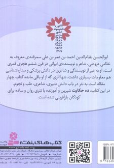 ابوالحسن نظامالدین احمد بن عمر بن علی سمرقندی معروف به نظامی عروضی، شاعر و نویسندهی ایرانی در قرن ششم هجری قمری است. او به غیر از نویسندگی و شاعری در دانش پزشکی و ستاره شناسی هم معلومات بسیاری داشت. تنها اثری که از او باقی مانده کتاب چهار مقاله است به نثر در باب دانش دبیری، شاعری، طب و نجوم. در این کتاب، ده حکایت شیرین و آموزنده با نثری روان و ساده برای کودکان بازآفرینی شده است.