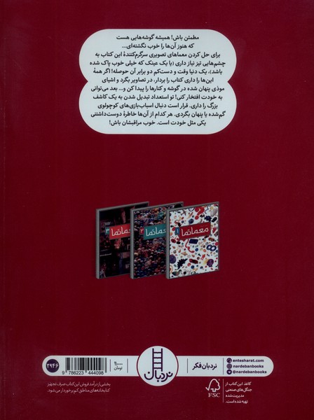 مطمئن باش! همیشه گوشههایی هست که هنوز آنا را خوب نگشتهای... برای حل کردن معماهای تصویری سرگرم کننده این کتاب به چشمهایی تیز نیاز داری ( با یک عینک که خیلی خوب پاک شده باشد)