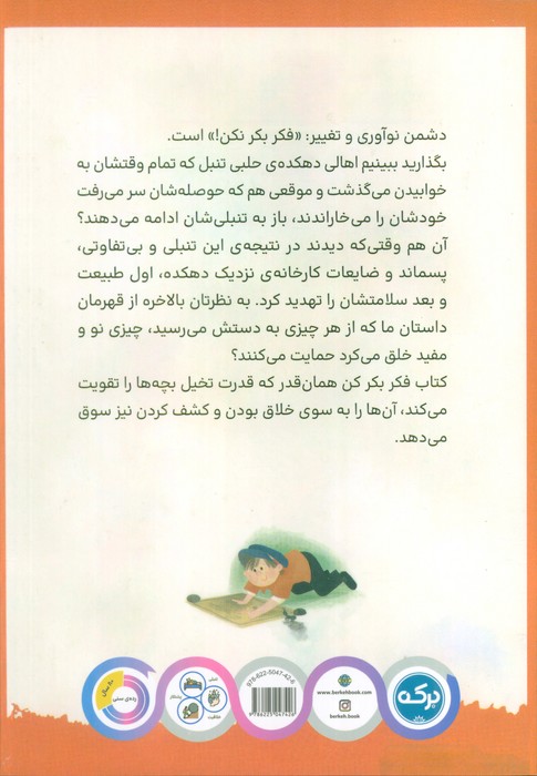 «فکر بکر کن (دهکدهٔ حلبی تنبل)» داستانی کودکانه است که در فضایی خیالی و طنزآمیز روایت میشود. کتاب در قالب قصهای فانتزی، زندگی اهالی دهکدهای را به تصویر میکشد که به تنبلی و بیتفاوتی نسبت به مشکلات عادت کردهاند. این اثر در سال ۱۴۰۳ منتشر شده و برای گروه سنی ۱۰ سال به بالا مناسب است. نویسنده با خلق شخصیتهایی با نامهای تکراری و ساده، فضای یکنواخت و بیتحرک دهکده را نشان میدهد. در این میان، شخصیت اصلی یعنی هکچهل با روحیهای متفاوت و خلاق، تلاش میکند تا با اختراعات و ایدههای تازه، مشکلات دهکده را حل کند. کتاب با بهرهگیری از عناصر طنز، اختراعات عجیب و ماجراهای غیرمنتظره، به موضوعاتی چون مسئولیتپذیری، اهمیت فکر کردن و مقابله با بیتفاوتی میپردازد. تصاویر کتاب نیز نقش مهمی در فضاسازی و انتقال پیام داستان دارند و به جذابیت آن برای مخاطبان نوجوان افزودهاند.