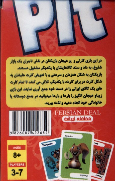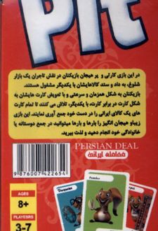 کارت بازی فکری پیت یا معامله ایرانی، نوعی بازی کارتی سه تا هفت نفره میباشد و از 8 سال به بالا میتوانید از این بازی لذت ببرید. اسم بازی pit است و از محبوبیت خاصی در سراسر دنیا برخوردار است.استفاده از محصولات تولیدی ایران در روی کارتهای بازی ، باعث جذابتر شدن این بازی برای بچه هاست. این بازی بسیار سرگرمکننده و هیجانانگیز برای جمعهای خانوادگی و دوستانه بسیار مناسب بوده و میتوان با آن ساعتها به بازی و سرگرمی پرداخت. ابعاد این کارت ها 55×85 میلی متر و از جنس گلاسه مرغوب میباشد. جدای از زیبایی و طراحی جدید، مهم ترین ویژگی این نسخه کارتهای گرم بالا و با دوام آن است. با داشتن این نسخه شما در هر کجا که باشید میتوانید از این بازی لذت ببرید.