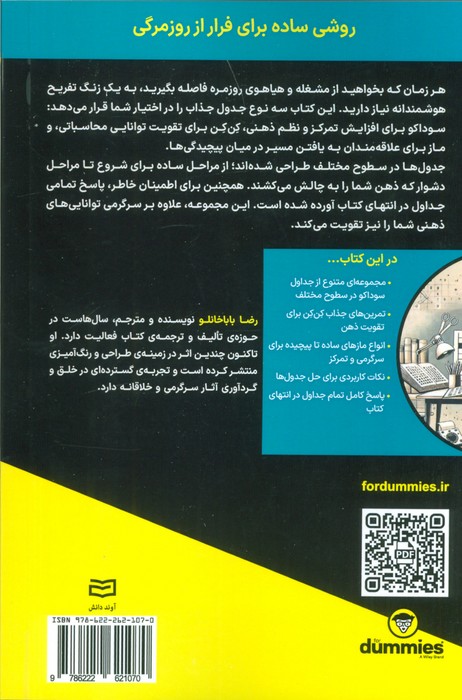 گاهی اوقات در زندگی، فرصت کافی برای انجام کارهای روزمره نداریم و گاه زمانهای زیادی را آزاد و بدون برنامه پیش روی خود میبینیم. این اتفاق در سفر و روزهای تعطیل بیشتر رخ میدهد. خواندن کتاب یکی از بهترین راهکارها برای گذراندن این روزهاست. اما برخی اوقات حوصله یا تمرکز کافی برای خواندن نداریم. برای این زمانها، حل جداول گوناگون را پیشنهاد میکنیم؛ چراکه علاوه بر کمک برای گذران وقت، ذهن شما را درگیر کرده تا از افکار منفی دور شده و برای جلوگیری از تنبلی مغز، آن را ورزش دهید. زنگ تفریح 1 For Dummies اولین کتاب از مجموعهای است که میخواهد با جداول و سرگرمیهای گوناگون، شما را در گذران وقت یاری کرده و ورزش ذهنی مناسبی برایتان فراهم کند. تصور ما این است که شما با این جداول آشنا هستید، پس در هر بخش بعد از توضیحی کوتاه، وارد جداول شده و در پایان، پاسخ آنها را برایتان قرار دادهایم.