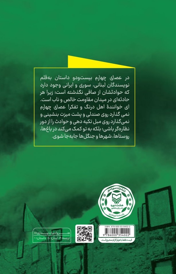 در عصای چهارم بیست و دو داستان به قلم نویسندگان، لبنانی سوری و ایرانی وجود دارد که حوادثشان از صافی نگذشته است؛ زیرا هر حادثهای در میدان مقاومت خالص و ناب است. ای خواننده اهل درنگ و تفکر عصای چهارم نمیگذارد روی صندلی و پشت میزت بنشینی و نمیگذارد روی مبل تکیه دهی و حوادث را از دور نظارهگر باشی؛ بلکه به تو کمک میکند در باغها روستاها، شهرها و جنگلها جابهجا شوی.