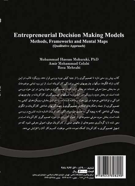 کتاب پیش رو سعی دارد تا تصمیمگیری را از جنبه کیفی مورد بررسی قرار دهد. رویکرد غالب در این کتاب ارائه الگوها، سبکها و چارچوبهای ذهنی و ادراکی کارآفرینانه است. از این رو تمامی موضوعات، در سه بخش مجزا معرفی میشوند: در بخش اول، کلیات تصمیمگیری و متون پیشین در این حوزه بررسی شده است. در بخش دوم، با رویکردی کیفی، به سبکهای تصمیمگیری کارآفرینانه و چارچوبهای ادراکی و فراشناختی موجود در این حوزه پرداخته شده است. در این بخش، رویکردهای کیفی به تصمیمگیری، از جمله راهکارهای ابتکاری تصمیمگیری و جهتگیریهای شناختی کارآفرینان، و الگوی پیچیدگی شناختی که به پیچیدگی ساختاری سیستم ادراکی کارآفرینان اشاره دارد، تشریح و بررسی شده است. بخش سوم، معرفی مجموعهای از اصول کاربردی در حوزه تصمیمگیری کارآفرینانه است، و سعی شده تا با گردآوری مجموعهای از مثالهای عملی از کارآفرینان موفق، اصولی را معرفی شود که در تسهیل تصمیمگیری به کارآفرینان کمک نموده، شانس موفقیت کسبوکار آنان را افزایش دهد.