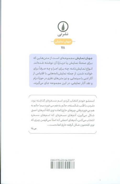 اسمشو خودم انتخاب کردم، اسم مسخرهای گذاشته بود، «مردن با قلب شکسته»، حالم به هم میخوره میم! حالم به هم میخوره وقتی چیزهای خارقالعاده توی کلهٔ آدمهای احمق شکل میگیرن، آدمهای مسخرهای که اسمهای مسخره انتخاب میکنن، آدمهای احمقی که اصلا نمیفهمن چیزی که توی کلهشون شکل گرفته خارقالعادهست…