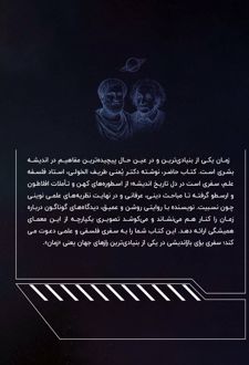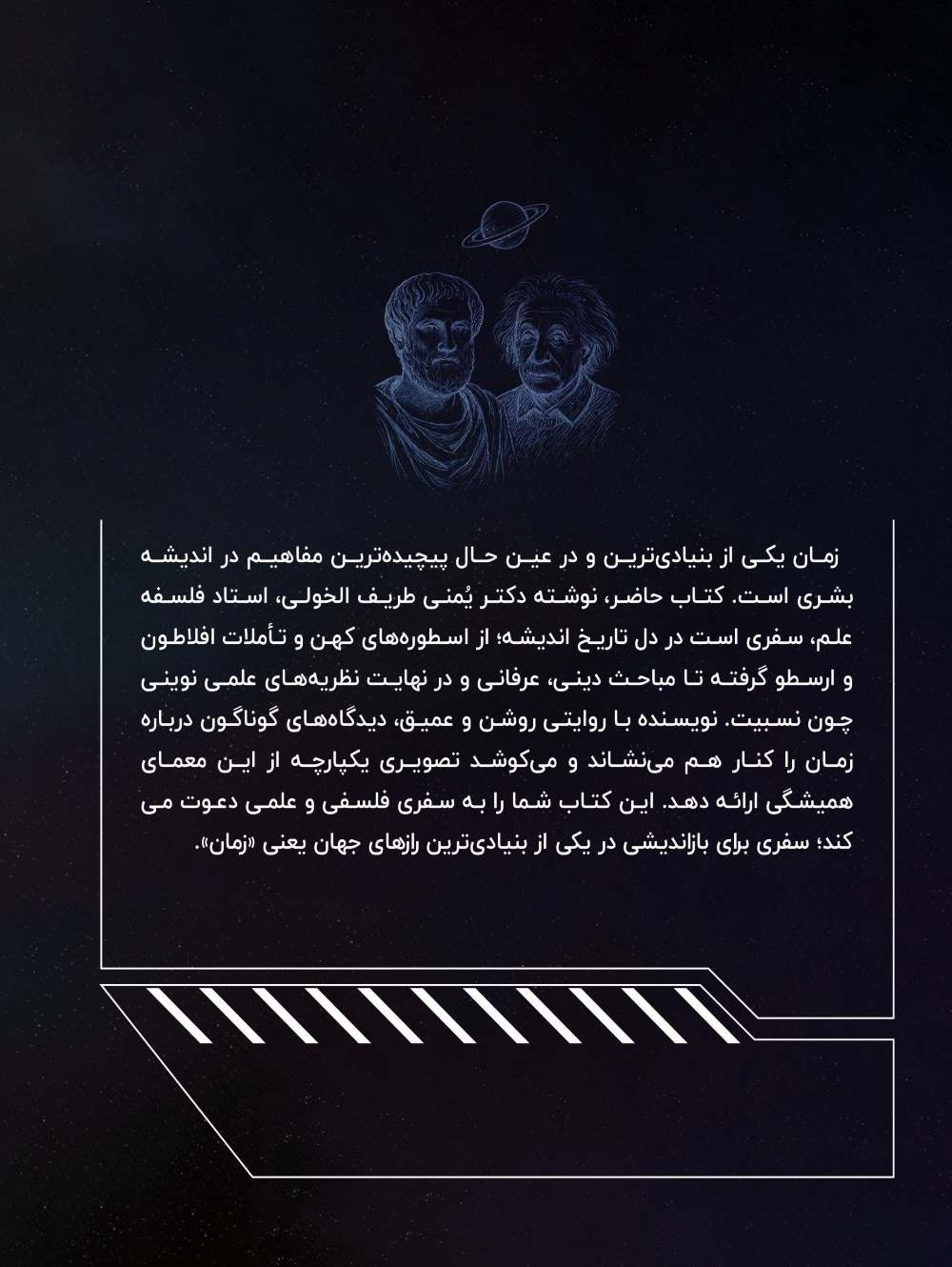 این کتاب با آغاز فلسفه یونانی شروع میشود و از قرون وسطی و تصورات اسلامی و مسیحی به طور یکسان گذر میکند و با جریانهای صوفیه و شهودی و رمانتیک و وجودی دیدار میکند. و البته ما بیشتر از هر چیزی در شرح جزئیات زمان عقلانی قابل اندازه گیری ومقیاس پذیر درنگ میکنیم، از دوران ارسطو و شارح بزرگش ابن رشد شروع میکنیم تا به زمان مطلق نیوتن برسیم و سرانجام با مضامین زمان نسبی انیشتین به پایان میرسیم.