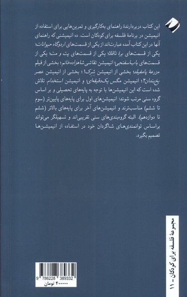 این کتاب دربردارندۀ راهنمای بهکارگیری و تمرینهایی برای استفاده از انیمیشن در برنامۀ فلسفه برای کودکان است. ده انیمیشنی که راهنمای آنها در این کتاب آمده عبارتاند از یکی از قسمتهای اردوگاه حیوانات؛ یکی از قسمتهای برۀ ناقلا؛ یکی از قسمتهای پت و مت؛ یکی از قسمتهای باباسفنجی؛ انیمیشن نقاشی شاهزادهخانم؛ بخشی از فیلم مزرعۀ پامفیلد؛ بخشی از انیمیشن شرک 1؛ بخشی از انیمیشن عصر یخبندان 2؛ انیمیشن مگس یکدقیقهای؛ و انیمیشن استخدام. تلاش شده است که این انیمیشنها به توجه به پایههای تحصیلی و بر اساس گروه سنی مرتب شوند: انیمیشنهای اول برای پایههای پایینتر (سوم تا ششم) مناسبترند و انیمیشنهای آخر برای پایههای بالاتر (ششم تا دوازدهم). البته گروهبندیهای سنی تقریبیاند و تسهیلگر میتواند بر اساس توانمندیهای شاگردان خود در استفاده از انیمیشنها تصمیم بگیرد.