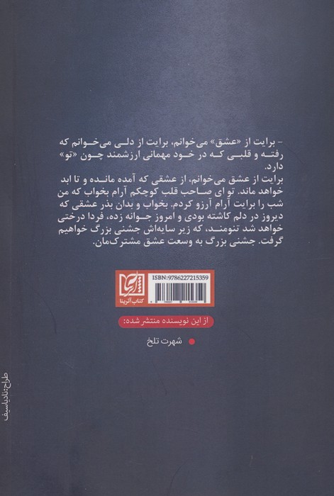 برایت از عشق میخوانم، از عشقی که آمده مانده و تا ابد خواهد ماند. تو ای صاحب قلب کوچکم آرام بخواب که من شب را برایت آرام آرزو کردم. بخواب و بدان بذر عشقی که دیروز در دلم کاشته بودی و امروز جوانه زده فردا درختی خواهد شد تنومند که زیر سایهاش جشنی بزرگ خواهیم گرفت. جشنی بزرگ به وسعت عشق مشترکمان.