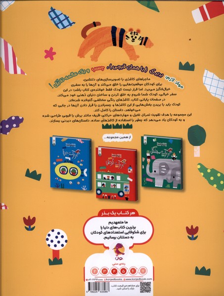 در مجموعهی کاغذی، کودک در هر جلد در موقعیتی جدید قرار میگیرد. فعالیتهای هر جلد براساس افزایش مهارتهای دستورزی و تمرینهای درست کردن کاردستی طراحی شدهاند. کودک میتواند از کاغذهای انتها یا حاشیهی کتاب برای بریدن و چسباندن و ساختن کاردستیهایش استفاده کند و کار با ابزارهایی چون «قیچی» و «چسب» را یاد بگیرد.
