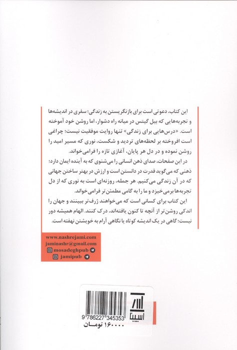 این کتاب دعوتی است برای بازنگریستن به زندگیری؛ سفری در اندیشهها و تجربههایی که بیل گیتس در میانه راه دشوار، اما روشن خود آموخته است. درسهایی برای زندگی تنها روایت موفقیت نیست؛ چراغی است افروخته بر لحظههای تردید و شکست، نوری که مسیر امید را روشن نموده و در دل هر پایان، آغازی تازه را فرا میخواند.