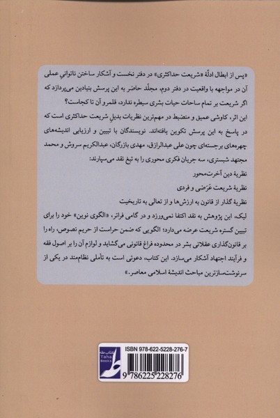 پس از ابطال ادله و شریعت حداکثری در دفتر نخست و آشکار ساختن ناتوانی عملی آن در مواجهه با واقعیت در دفتر دوم مجلد حاضر به این پرسش بنیادین میپردازد که اگر شریعت بر تمام ساحات حیات بشری سیطره ندارد، قلمرو آن تا کجاست؟