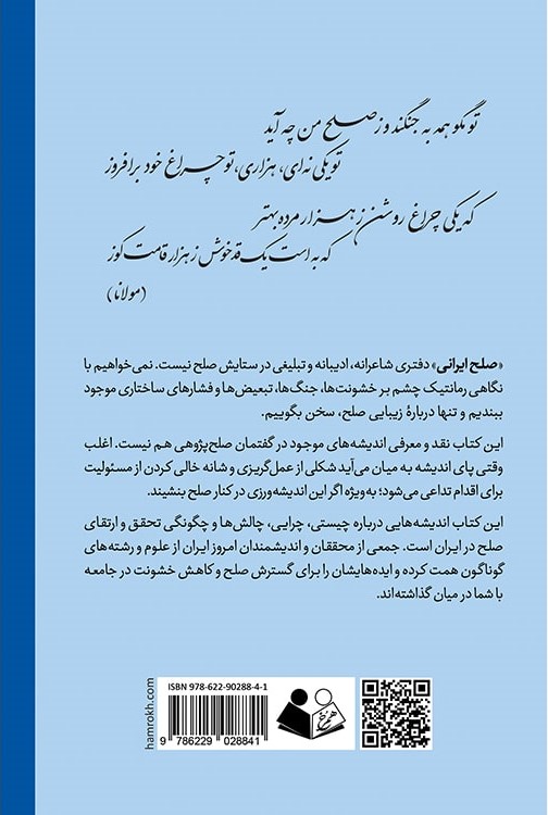 کتابی که پیش روی دارید اندیشههایی درباره چیستی، چرایی، چالشها و چگونگی تحقق و ارتقای صلح در ایران است. جمعی از محققان و اندیشمندان امروز ایران از دانش ها و رشتههای گوناگون علوم سیاسی، علوم اجتماعی، علوم تربیتی، فلسفه، روانشناسی، ادبیات و رشتههای دیگر همت کرده و ایدههایشان را برای گسترش صلح و کاهش خشونت در ایران قلمی کرده و در این کتاب تقدیم شما می کنند. اغلب آنها برای شما و حوزه عمومی ایران و عامه اهل فکر نامآشنا هستند.