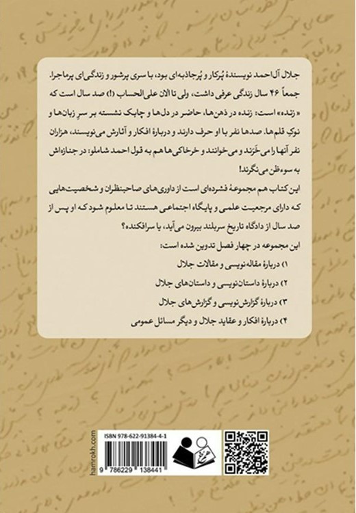 توضیحاتتوضیحات تکمیلینظرات (۱) کتاب صدسالگی؛ قضاوت تاریخ دربارهٔ جلال آل احمد، دومین کتاب انتشارات همرخ درباره جلال آل احمد است که به همت جناب آقای محمدحسین دانایی (خواهرزاده آل احمد) تهیه و تدوین شده است. در این کتاب، جمعی از اندیشمندان و نویسندگان ایرانی نظرات خود را درباره آثار و آرای آل احمد به رشته تحریر درآوردهاند که روی هم تصویر کلی و نسبتا کاملتری از جلال را ارائه میکند و او را در بوته نقد میآزمایند. قسمتی از مقدمه کتاب به قلم محمدحسین دانایی تاریخ پدیدهٔ غریبی است، چیزی شبیه یک دادگاه شبانهروزی، یکسره کار میکند، میبرد و میدوزد، بعضیها را به عرش میفرستد و بعضیها را به زیر فرش. جلال آلاحمد نویسندهٔ پرکار و پرجاذبهای بود، با سری پرشور و زندگیای پرماجرا. جمعا ۴۶ سال زندگی عرفی داشت، ولی تا الآن علیالحساب(!) صد سال است که “زنده” است: زنده در ذهنها، حاضر در دلها و چابک نشسته بر سر زبانها و نوک قلمها. صدها نفر با او حرف دارند و دربارهٔ افکار و آثارش مینویسند، هزاران نفر آنها را میخرند و میخوانند و خرخاکیها هم به قول احمد شاملو: در جنازهاش به سوءظن مینگرند! آدم صاف و صادق و صریحی بود، خوب و دقیق میدید و بیملاحظه هم مینوشت. در مقدمة کتاب “ارزیابی شتابزده” ماجرایی را نقل میکند از یکی از استادانش، یعنی مرحوم عباس اقبال آشتیانی که به دانشجویان دانشسرای عالی، “تاریخ تمدن” درس میداد. این استاد که یک مورخ مدقق بود، عقیده داشت: «هیچ واقعهای را تا صد سال بر آن نگذرد، نمیتوان داوری کرد.» ولی شاگردش که نه محقق بود و نه مدقق، به گونه دیگری فکر میکرد: «آخر اگر من نگویم که از این آش داغ دهانم سوخت، که بداند که بر سر این سفرهٔ بلا چهها بر ما رفتهاست؟» ناصرخسرو قبادیانی هم گویا از همین قماش بوده که گفته: هم امروز از پشت، بارت بیفکن- میفکن به فردا، مر این داوری را… چنین آلاحمدها و چنان ناصرخسروهایی هستند که حقایق ناب امروز را ثبت و ضبط میکنند تا فردا به دست همان محققان مدقق برسند.