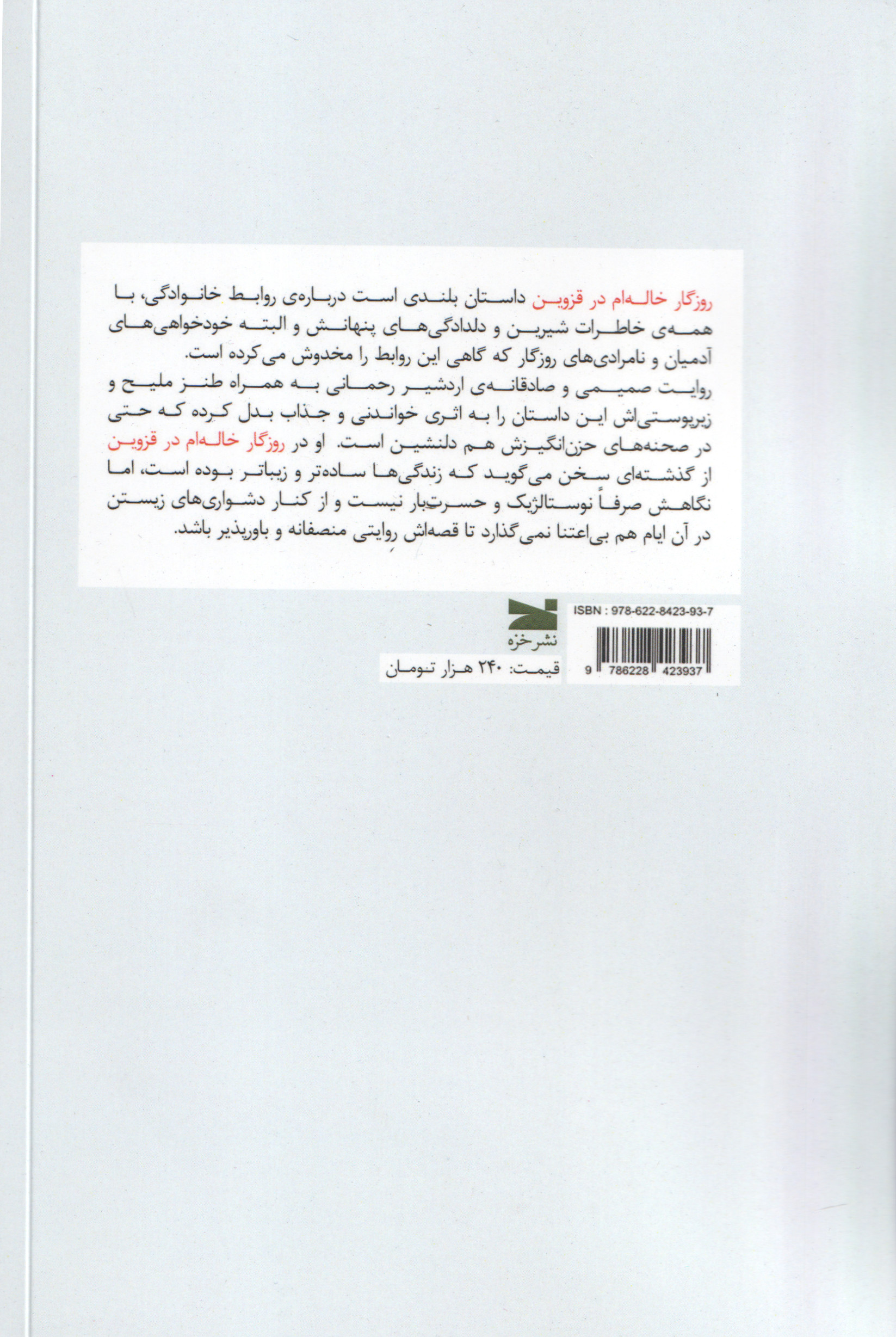 روایت صمیمی و صادقانهی اردشیر رحمانی به همراه طنز ملیح و زیرپوستیاش این داستان را به اثری خواندنی و جذاب بدل کرده که حتی در صحنههای حزنانگیزش هم دلنشین است. او در روزگار خالم در قزوین از گذشتهای سخن میگوید که زندگیها سادهتر و زیباتر بوده است، اما نگاهش صرفا نوستالژیک و حسرتبار نیست و از کنار دشواریهای زیستن در آن ایام هم بیاعتنا نمیگذارد تا قصهاش روایتی منصفانه و باورپذیر باشد.