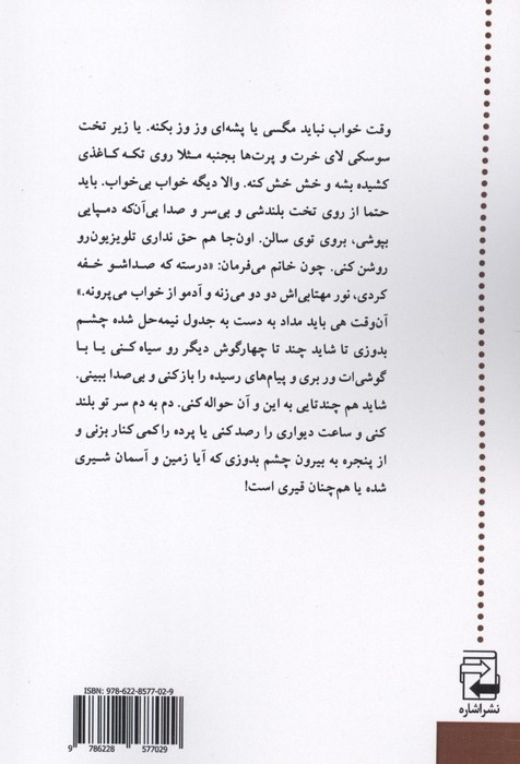 وقت خواب نباید مگسی با پشهای وز وز بکنه یا زیر تخت سوسکی لای خرت و پرتها بجنبه مثلا روی تکه کاغذی کشیده بشه و خش خش کنه والا دیگه خواب بیخواب باید حتما از روی تخت بلندشی و بیسر و صدا بیآن که دمپایی بپوشی بروی توی سالن اونجا هم حق نداری تلویزیون رو روشن کنی چون خانم میفرمان درسته که صداشو خفه کردی، نور مهتابیاش دو دو میزنه و آدمو از خواب میپرونه آن وقت هی باید مداد به دست به جدول نیمه حل شده چشم بدوزی تا شاید چند تا چهارگوش دیگر رو سیاه کنی یا با گوشیات وربری و پیامهای رسیده را باز کنی و بیصدا ببینی شاید هم چندتایی به این و آن حواله کنی. دم به دم سر تو بلند کنی و ساعت دیواری را رصد کنی با پرده را کمی کنار بزنی و از پنجره به بیرون چشم بدوزی که آیا زمین و آسمان شیری شده با هم چنان قیری است.