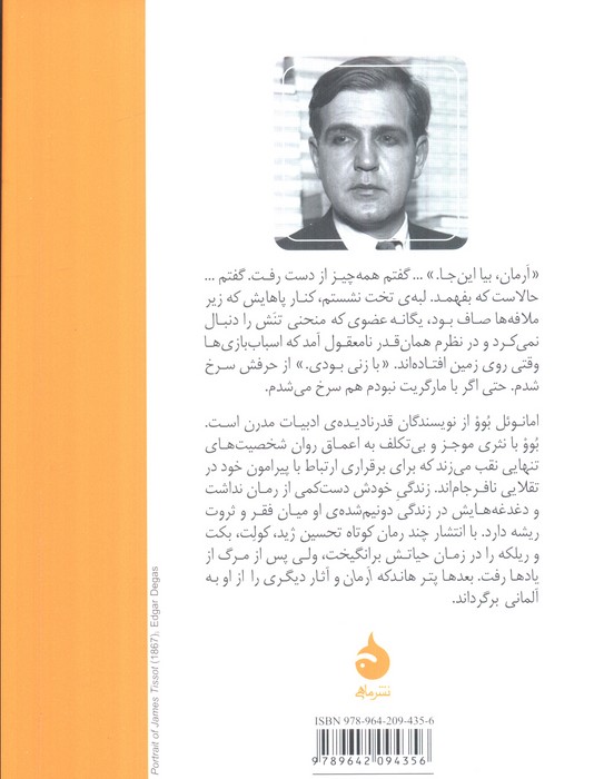 «ارمان، بیا اینجا.» ... گفتم همه چیز از دست رفت. گفتم ..... حالاست که بفهمد. لبهی تخت نشستم، کنار پاهایش که زیر ملافهها صاف بود. یگانه عضوی که منحنی تنش را دنبال نمیکرد و در نظرم همان قدر نامعقول آمد که اسباب بازیها وقتی روی زمین افتادهاند. «با زنی بودی.» از حرفش سرخ شدم: حتی اگر با مارگریت نبودم هم سرخ میشدم. امانوئل بوو از نویسندگان قدر نادیدهی ادبیات مدرن است. بوو با نثری موجز و بیتکلف به اعماق روان شخصیتهای تنهایی نقب میزند که برای برقراری ارتباط با پیرامون خود در تقلایی نافرجاماند. زندگی خودش دست کمی از رمان نداشت و دغدغههایش در زندگی دو نیم شدهی او میان فقر و ثروت ریشه دارد. با انتشار چند رمان کوتاه تحسین ژید، کولت، بکت و ریلکه را در زمان حیاتش برانگیخت، ولی پس از مرگ از یادها رفت. بعدها پتر هاندکه ارمان و آثار دیگری را از او به آلمانی برگرداند.