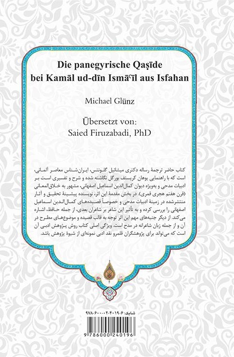 کتاب حاضر ترجمه رساله دکتری میشائیل گلونتس، ایرانشناس معاصر آلمانی، است که با راهنمایی یوهان کریستف بورگل نگاشته شده و شرح و تفسیری است بر ادبیات مدحی و بهویژه دیوان کمالالدین اسماعیل اصفهانی، مشهور به خلاقالمعانی (قرن هفتم هجری قمری). در بخش مقدمه این اثر، نویسنده پیشینه تحقیق و آثار منتشرشده در زمینه ادبیات مدحی و خصوصا قصیدههای کمالالدین اسماعیل اصفهانی را بررسی کرده و به تأثیر این شاعر بر شاعران بعدی، از جمله حافظ، اشاره میکند. از دیگر جنبههای مهم این اثر توجه به قالب قصیده و موضوعهای مطرح در آن و از جمله زبان شاعرانه در مدح است. ویژگی اصلی کتاب روش پژوهش ادبی آن است که میتواند برای پژوهشگران قلمرو نقد ادبی نمونهای از شیوه پژوهش باشد.