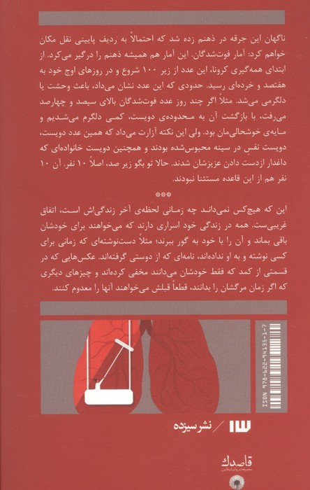 این کتاب روایت گذران دوران بیماری کرونای نویسنده درحالی است که ۷۰ درصد از ریهاش درگیر شده. نویسنده سعی دارد با واقعبینی و طنز خاصی، آگاهی بخشی درستی از این بیماری به خواننده داده و همچنین خاطرات روزهایی که دچار بیماری شده و در بیمارستان گذرانده است را بازگـو کنـد. غـم، شادی، اضطراب و امید در این کتاب مفهوم زیبایی مییابند.