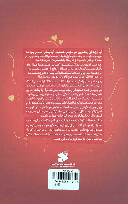 تلاش میکند مرد و زن را در بهبود زندگی مشترک راهنمایی کند. در این جلد در ابتدا روشهایی آموزش داده میشود تا شما بتوانید رفتارهای فردی و اجتماعی خود را در کانون خانواده اصلاح نموده و ارتقا دهید. همچنین با فهم درست از انتقادپذیری و اجرای صحیح آن میتوانید نواقص یکدیگر را برطرف سازید و ابعاد شخصیتی خود را به نسخه بهتری بدل سازید. در بخشهای بعدی این کتاب نویسنده به شما آموزش میدهد به عنوان یک تیم چطور بتوانید از چالشهای مختلفی که در زندگی با آنها مواجه میشوید به سلامت گذر نمایید و این طوفان حوادث باعث نشود تا روابط شما شکرآب گردد. همچنین در این کتاب فرامیگیرید همکاری سالم در میان زن و شوهر مزیتهای بسیاری دارد که باعث میشود بسیاری از مشکلات و گرفتاریها را آسانتر از سر بگذرانید به همین خاطر روشهایی برای همفکری و مشورت را به شما پیشنهاد میدهد. این اثر به شکل کاربردی و متناسب با مقتضیات روز نگاشته شده و در طول آن با استفاده از مثالهای ملموس سعی نموده تا به شیواترین شکل مباحث را در ذهن مخاطب جا بیاندازد.