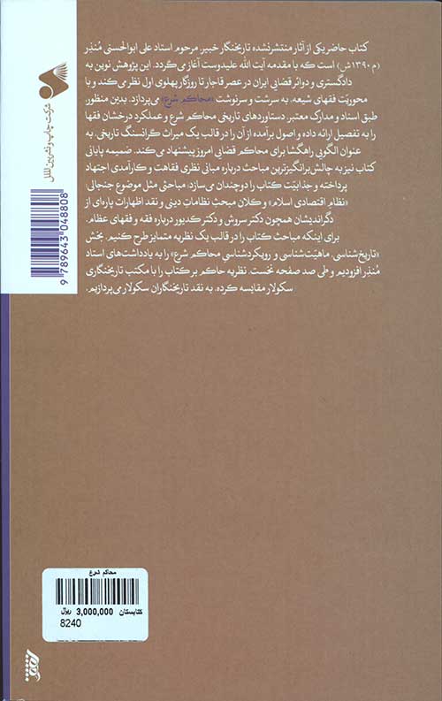 این پژوهش نوین به دادگستری و دوائر قضایی ایران در عصر قاجار تا روزگار پهلوی اول نظر می کند و با محوریت فقه ای شیعه به سرشت و سرنوشت محاکم شرع می پردازد. بدین منظور، طبق اسناد و مدارک معتبر دستاوردهای تاریخی محاکم شرع و عملکرد درخشان فقها را به تفصیل ارائه داده و اصول برآمده از آن را در قالب یک میراث گران سنگ تاریخی به عنوان الگویی راه گشا برای محاکم قضایی امروز پیشنهاد می کند. ضمیمه پایانی کتاب نیز به چالش برانگیزترین مباحث درباره مبانی نظری فقاهت و کارآمدی اجتهاد پرداخته و جذابیت کتاب را دو چندان میسازد مباحثی مثل موضوع جنجالی «نظام اقتصادی «اسلام» و کلان مبحث نظامات دینی و نقد اظهارات پاره ای از دگراندیشان همچون دکتر سروش و دکتر کدیور درباره فقه و فقهای عظام. برای اینکه مباحث کتاب را در قالب یک نظریه متمایز طرح کنیم، بخش «تاریخ شناسی ماهیت شناسی و رویکردشناسی محاکم شرع» را به یادداشتهای استاد منذر افزودیم و طی صد صفحه نخست نظریه حاکم برکتاب را با مکتب تاریخ نگاری سکولار مقایسه کرده به نقد تاریخ نگاران سکولار می پردازیم.