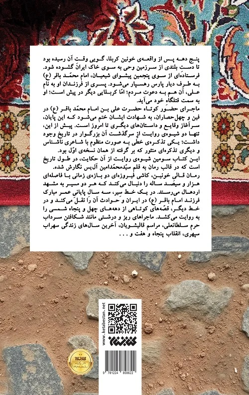 پنج دهه پس از واقعه ی خونین کربلا، گویی وقت آن رسیده بود تا دست بلندی از سرزمین وحی به سوی خاک ایران گشوده شود. فرستاده ای از سوی پنجمین پیشوای شیعیان امام محمد باقر (علیه السلام) به طرف دیار پارس رهسپار میشود. پسری از فرزندان او به نام علی آن هم به دعوت مردم؛ اما کربلایی دیگر در پیش است؛ او به سمت قتلگاه خود می آید. ماجرای حضور کوتاه حضرت علی بن امام محمد باقر (علیه السلام) در فین و چهل حصاران به شهادت ایشان ختم می شود که این پایان سرآغاز وقایع و داستانهای دیگری تا امروز است. پیش از این تنها دو شیوه ی روایت از سرگذشت آن بزرگوار در تاریخ وجود داشت؛ یکی تذکره ی خطی به صورت منظوم با شاعری ناشناس و دیگری تذکره ای منشور که بر گرفته از همان نسخه ی اول بود. این کتاب سومین شیوه ی روایت از آن حکایت در طول تاریخ است که در قالب رمان به قلم سید محمد امین آلیس نگارش شده. رمان قالی خونین کاشی فیروزه ای در بازه ی زمانی با فاصله ای هزار و سیصد ساله را دنبال میکند که هر دو مسیر به مشهد اردهال می رسند. در یک خط میر سه سال پایانی عمر مبارک فرزند امام باقر (علیه السلام) در ایران و حوادث آن را نقل می کند و در خط دیگر قصه های کوتاهی از دهه های چهل و پنجاه شمسی را به روایت میکشد. ماجراهای ریز و درشتی مانند شکافتن سرداب حرم سلطانعلی مراسم قالیشویان آخرین سالهای زندگی سهراب سپهری انقلاب پنجاه و هفت و..