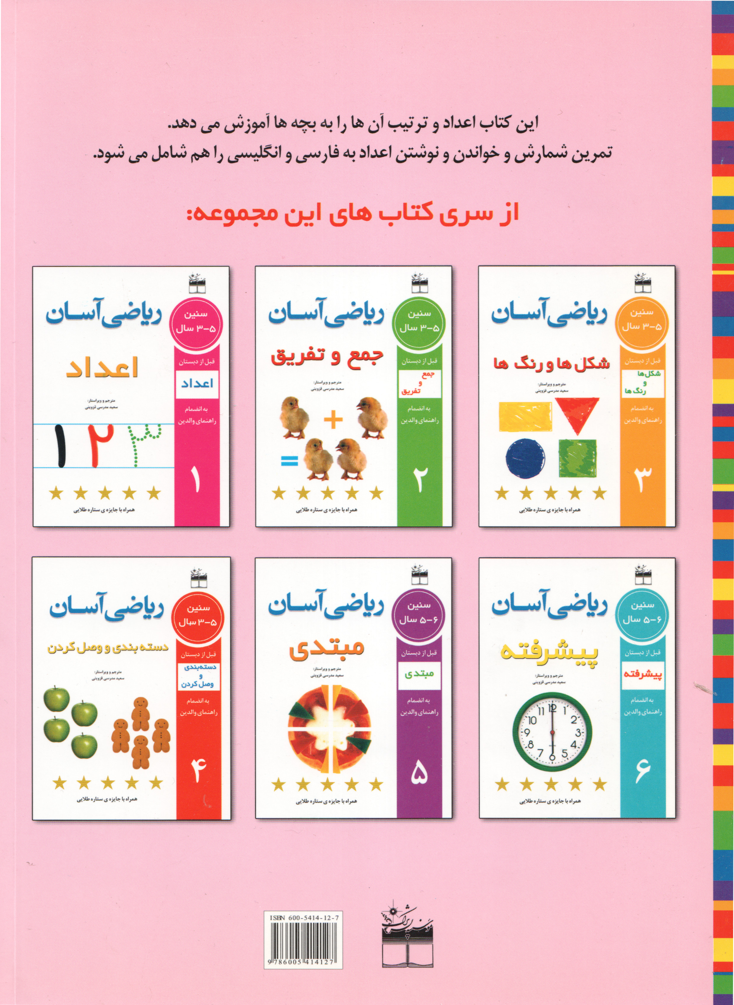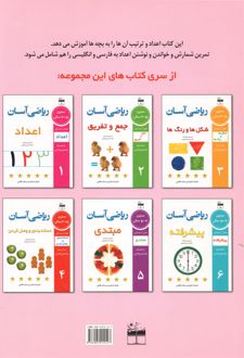این کتاب اعداد و ترتیب آنها را به بچهها آموزش میدهد. تمرین شمارش و خواندن و نوشتن اعداد به فارسی و انگلیسی را هم شامل میشود.