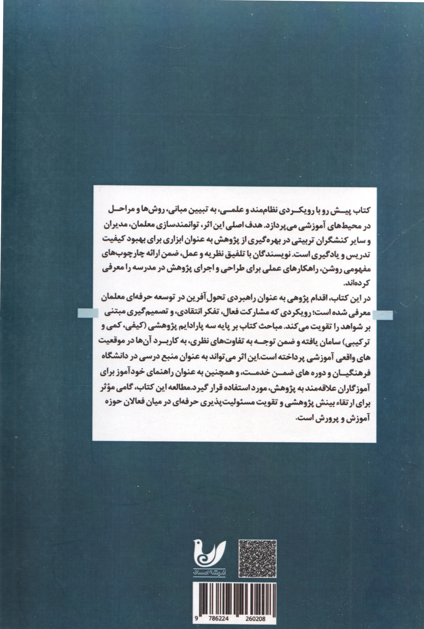 در این کتاب، اقدام پژوهی به عنوان راهبردی تحولآفرین در توسعه حرفهای معلمان معرفی شده است؛ رویکردی که مشارکت فعال، تفکر انتقادی، و تصمیمگیری مبتنی بر شواهد را تقویت میکند. مباحث کتاب بر پایه سه پارادایم پژوهشی (کیفی، کمی و ترکیبی) سامان یافته و ضمن توجه به تفاوتهای نظری، به کاربرد آنها در موقعیتهای واقعی آموزشی پرداخته است.این اثر میتواند به عنوان منبع درسی در دانشگاه فرهنگیان و دوره های ضمن خدمت، و همچنین به عنوان راهنمای خودآموز برای آموزگاران علاقهمند به پژوهش، مورد استفاده قرار گیرد.مطالعه این کتاب، گامی موثر برای ارتقاء بینش پژوهشی و تقویت مسئولیتپذیری حرفهای در میان فعالان حوزه آموزش و پرورش است.