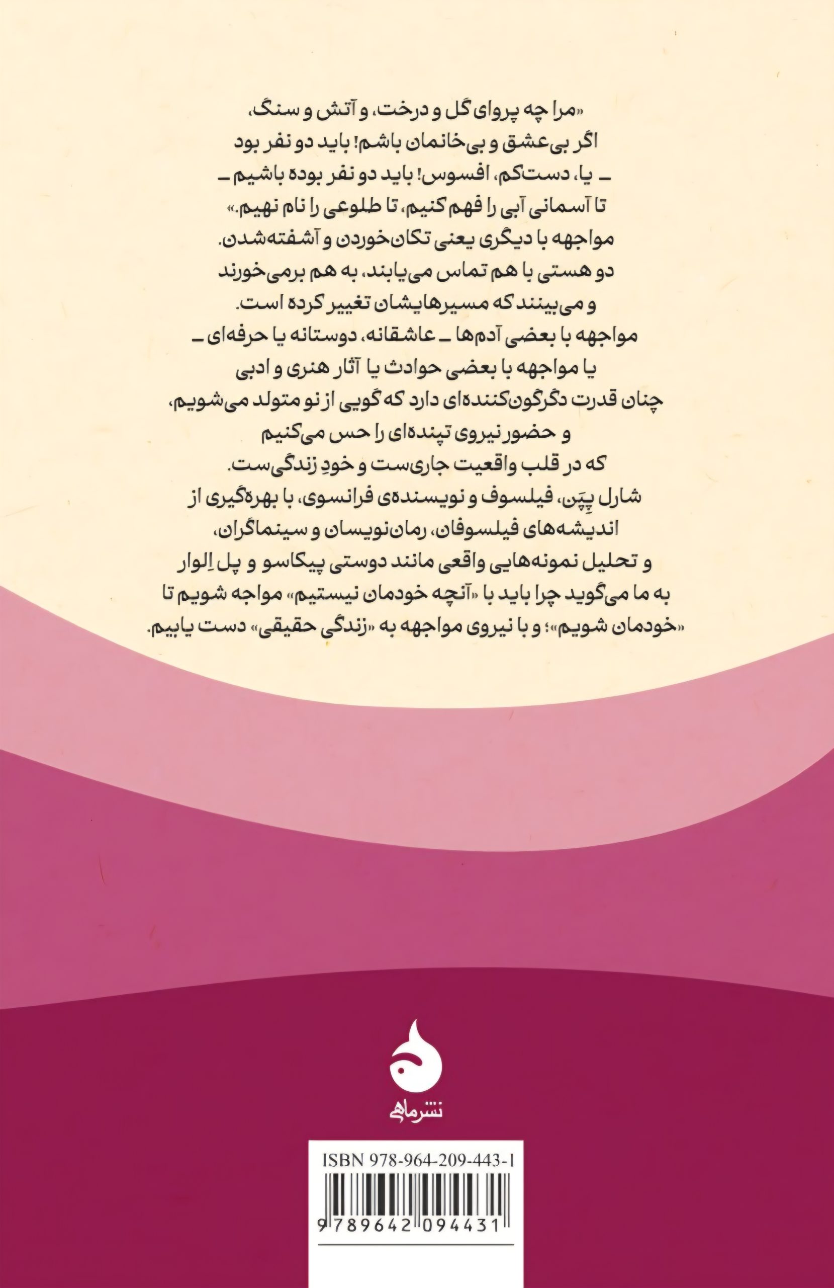«مرا چه پروای گل و درخت، و آتش و سنگ، اگر بیعشق و بیخانمان باشم! باید دو نفر بود -یا، دستکم، افسوس! باید دو نفر بوده باشیم- تا آسمانی آبی را فهم کنیم، تا طلوعی را نام نهیم.» مواجهه با دیگری یعنی تکانخوردن و آشفتهشدن. دو هستی با هم تماس مییابند، به هم برمیخورند و میبینند که مسیرهایشان تغییر کرده است. مواجهه با بعضی آدمها -عاشقانه، دوستانه یا حرفهای- یا مواجهه با بعضی حوادث یا آثار هنری و ادبی چنان قدرت دگرگونکنندهای داردکه گویی از نو متولد میشویم، و حضور نیروی تپندهای را حس میکنیم که در قلب واقعیت جاریست و خود زندگیست. شارل پپن، فیلسوف و نویسندهی فرانسوی، با بهرهگیری از اندیشههای فیلسوفان، رماننویسان و سینماگران، و تحلیل نمونههایی واقعی مانند دوستی پیکاسو و پل الوار به ما میگوید چرا باید با آنچه «خودمان نیستیم» مواجه شویم تا «خودمان شویم»؛ و با نیروی مواجهه به «زندگی حقیقی» دست یابیم.