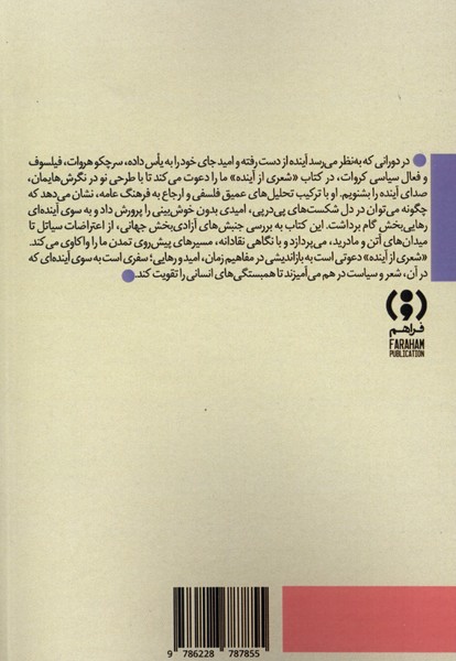 در دورانی که به نظر میرسد آینده از دست رفته و امید جای خود را به یاس داده سرچکو هروات، فیلسوف و فعال سیاسی کروات در کتاب شعری از آینده ما را دعوت میکند تا با طرحی نو در نگرشهایمان صدای آینده را بشنویم او با ترکیب تحلیلهای عمیق فلسفی و ارجاع به فرهنگ عامه نشان میدهد که چگونه میتوان در دل شکستهای پی در پی امیدی بدون خوش بینی را پرورش داد و به سوی آیندهای رهایی بخش گام برداشت. این کتاب به بررسی جنبشهای آزادی بخش جهانی از اعتراضات سیاتل تا میدانهای آتن و مادرید میپردازد و با نگاهی نقادانه مسیرهای پیش روی تمدن ما را و اکاوی میکند. شعری از آینده دعوتی است به بازاندیشی در مفاهیم زمان امید و رهایی سفری است به سوی آیندهای که در آن شعر و سیاست درهم میآمیزند تا همبستگیهای انسانی را تقویت کند.