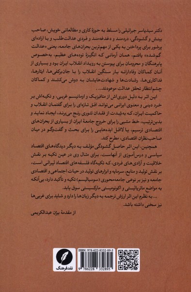 دکتر سیدیاسر جبرائیلی را مسلط به حوزه کاری و مطالعاتی خویش، صاحب بینش و گشودگی، دردمند و دغدغهمند و فردی عدالتطلب و با ارادهای پرشور برای پرداختن به یکی از مهمترین بحرانهای جامعه، یعنی «عدالت گمشده» یافتم، همان آرمانی که انگیزۀ تودههای عظیم، بهخصوص پابرهنگان و محرومان برای پیوستن به رویداد انقلاب ایران بود و بسیاری از آنان کماکان وفادارانه بار سنگین انقلاب را با جانبرکفیها، ایثارها، فداکاریها، رشادتها و شهادتهایشان به دوش میکشند و کماکان چشمانتظار تحقق عدالت موعودند… . این اثر به دلیل دوریاش از متافیزیک و اومانیسم غربی، و تکیهاش بر خرد دینی و معنوی ایرانی میتواند افق تازهای را برای گفتمان انقلاب و حاکمیت ایران، که بهشدت از فقدان تئوری رنج میبرند، ایجاد نماید و بدینترتیب، خط مشیی را برای خروج جامعۀ ایران از بسیاری از بحرانهای اقتصادی ترسیم، یا لااقل ایدههایی را برای بحث و گفتوگو در میان صاحبنظران اقتصادی، مطرح کند. همچنین، این اثر حاصل گشودگی مولف به دیگر دیدگاههای اقتصاد سیاسی و درسآموزی از آنهاست. برای مثال وی در عین تکیه بر نقش خلاقیت و آزادیهای فردی، که تکیهگاه فلسفههای اقتصاد لیبرالی است، بر نقش تولید و منابع، سرمایه و ابزارهای تولید در حیات اجتماعی و اقتصادی جامعه و نیز بر نوعی جامعهمحوری (سوسیالیسم) تکیه و تأکید دارد، بیآنکه به مواضع ماتریالیستی و اکونومیستی مارکسیستی سوق یابد. … به نظرم این اثر ارزش ترجمه به دیگر زبانها را دارد و شاید برای غربیها نیز سخنی داشته باشد.