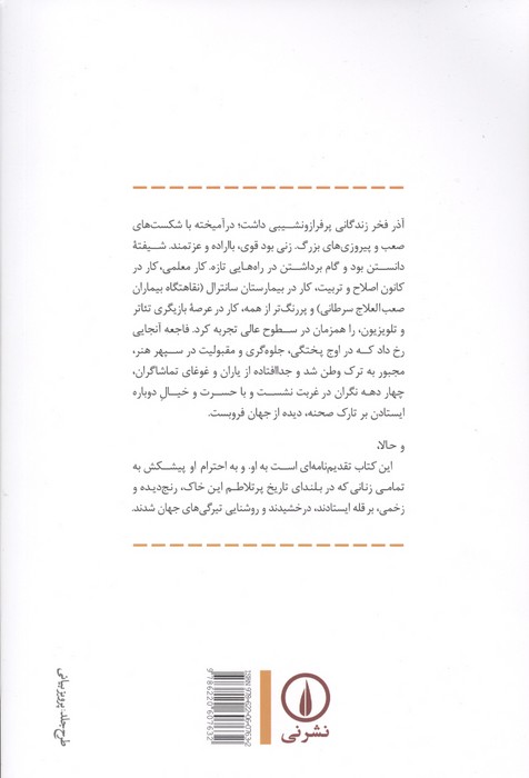 آذر فخر زندگانی پرفرازونشیبی داشت؛ درآمیخته با شکستهای صعب و پیروزیهای بزرگ. زنی بود قوی، بااراده و عزتمند. شیفتۀ دانستن بود و گام برداشتن در راههایی تازه. کار معلمی، کار در کانون اصلاح و تربیت، کار در بیمارستان سانترال (نقاهتگاه بیماران صعبالعلاج سرطانی) و پررنگتر از همه، کار در عرصۀ بازیگری تئاتر و تلویزیون، را همزمان در سطوح عالی تجربه کرد. فاجعه آنجایی رخ داد که در اوج پختگی، جلوهگری و مقبولیت در سپهر هنر، مجبور به ترک وطن شد و جداافتاده از یاران و غوغای تماشاگران، چهار دهه نگران در غربت نشست و با خیال دوباره ایستادن بر تارک صحنه، دیده از جهان فروبست.